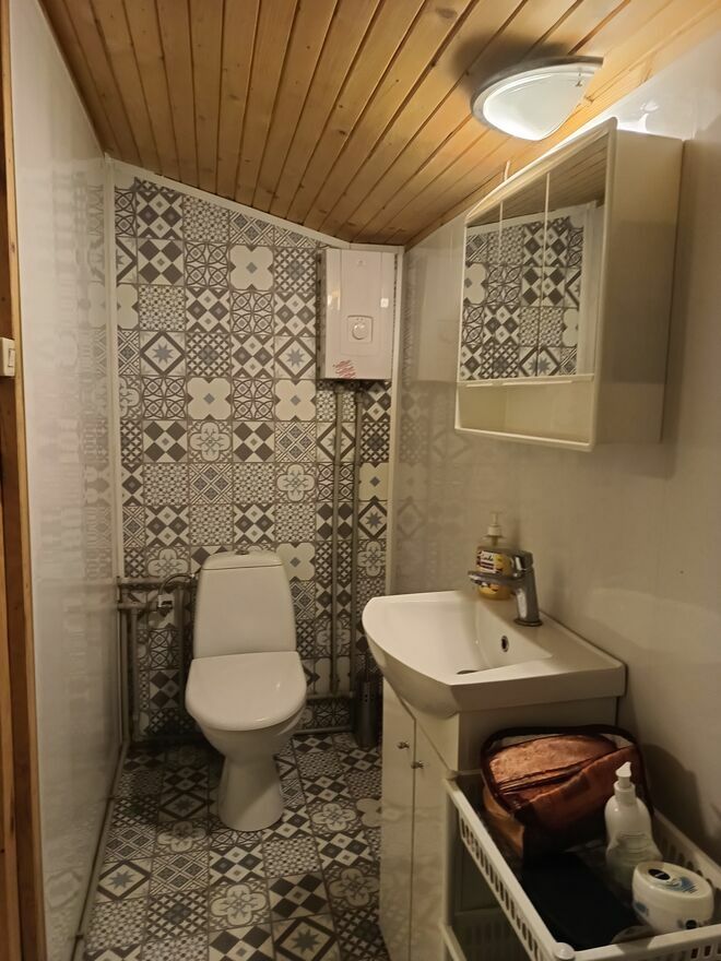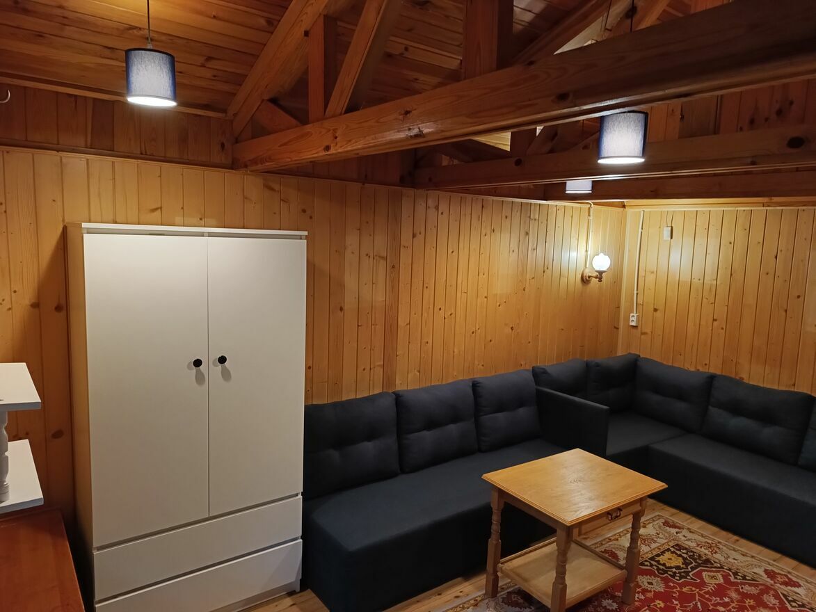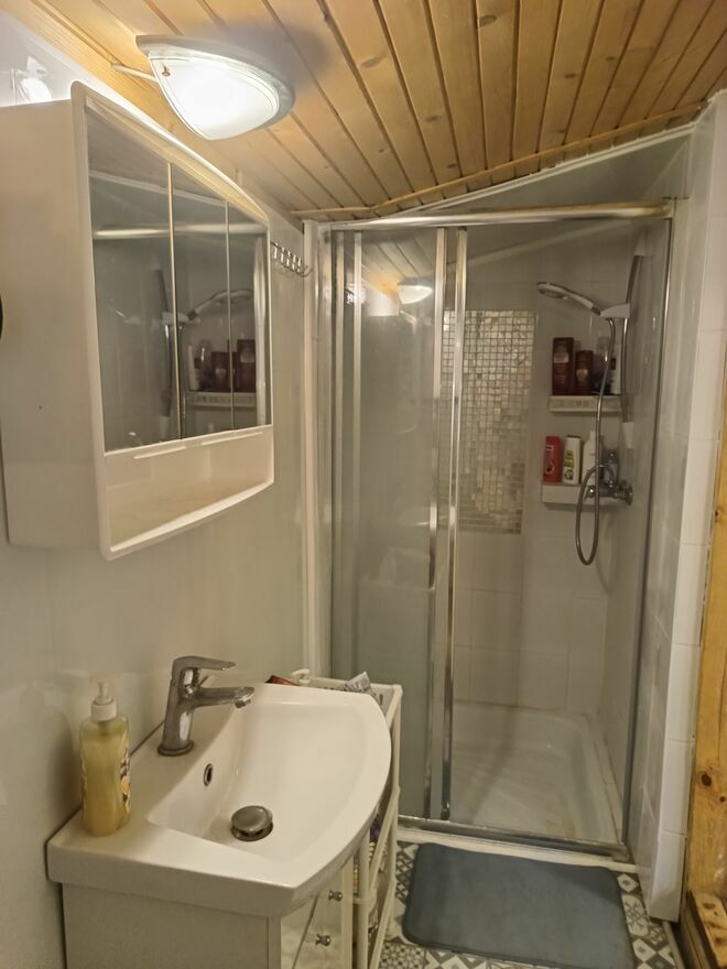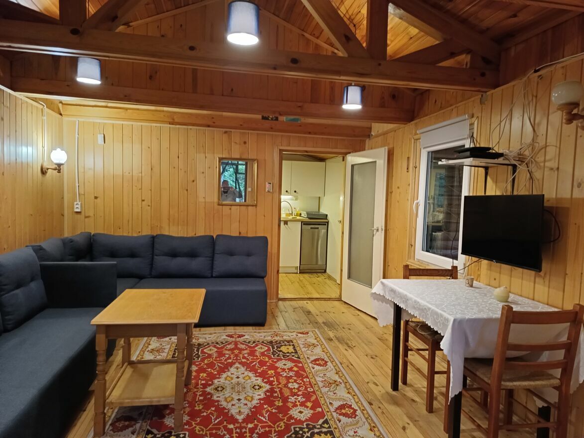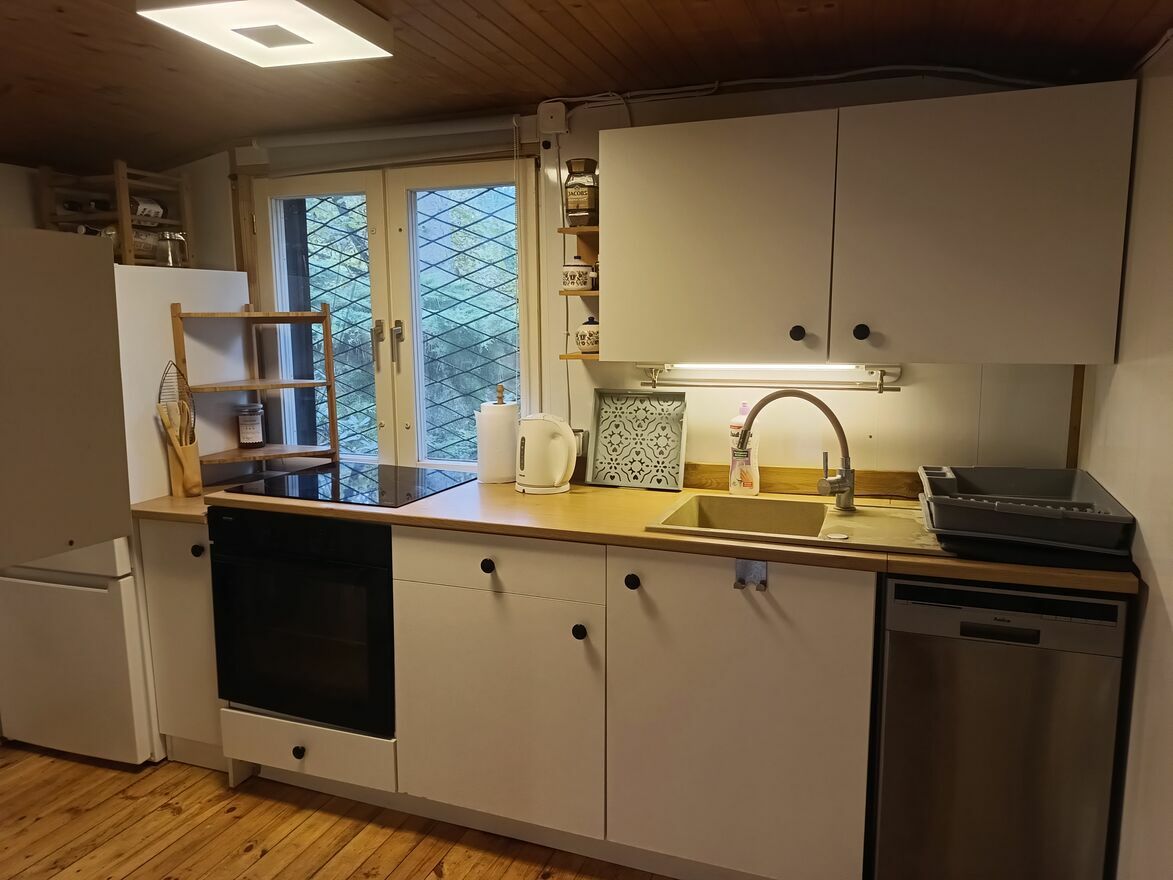 Na działce znajduje się domek o powierzchni ok. 50 m2: dwa pokoje, osobna kuchnia (meble IKEA, lodówka, płyta indukcyjna, piekarnik, zmywarka) oraz łazienka z prysznicem.